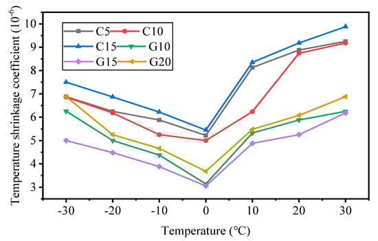 The temperature shrinkage test referred to Chinese National Standard JTG E51-2019. Specimens of 40 mm × 40 mm × 160 mm were made and kept in a standard curing room with a temperature of 20 ± 2 °C and a relative humidity of more than 95% for 7 days. Then, they were placed in an electric blowing dry oven with a temperature of 105 °C for 10–12 h. Afterwards, they were set in a dry and ventilated environment to cool to room temperature, and the initial length value was measured. At the beginning of the test, the temperature was 30 °C; it was reduced by 10 °C at each step. Then, the sample was kept at each temperature for 4 h. The data were recorded at each time-step until the temperature reached −30 °C.