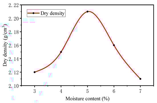 In this investigation, an optimization mix in which aeolian sand was partially replaced by gravel was prepared and tested. The density of gravel was 2.5 g/cm3. The reason why the gravel partially replaced the aeolian sand is that the addition of gravel transforms the poorly graded aeolian sand into a well-graded material and can meet the pavement strength requirements while reducing the content of cementitious materials. In addition, the rebound modulus is also an important index used to evaluate the road base material. When the base course thickness was 20 cm, the rebound modulus of semi-rigid base course material should be controlled between 1100 and 1700 MPa. The gravel partially replaced the aeolian sand, which can increased the rebound modulus from 800 MPa to 1500 MPa, thus, meeting the engineering requirements. For the optimization mix, the amount of cementing material, gravel, and aeolian sand was 8%, 55% and 37%, respectively. Aeolian sand and gravel were used as the primary materials of the mix so the cost could be minimized. The relationship between moisture content and dry density is shown in Figure 10. Looking at the figure, we observed that the optimal moisture content of the solidified material was 5%, and the corresponding maximum dry density was 2.21 g/cm3. From the compaction test, it can be seen that the optimum water content of the mixture was reduced from 17% to 5% because the gravel was partially used to replace the aeolian sand. When the proportion of fine aggregate was reduced, the specific surface area of the mixture decreased, leading to the reduction of water absorbed on the surface. As a result, the optimum water content was reduced during compaction. To prepare the optimization mix, the same geopolymer paste (Si2.5N0.8) was prepared and poured into the mixture at the predetermined w/s ratio (0.46). Then, extra water was added to the mixture to meet the OWC.