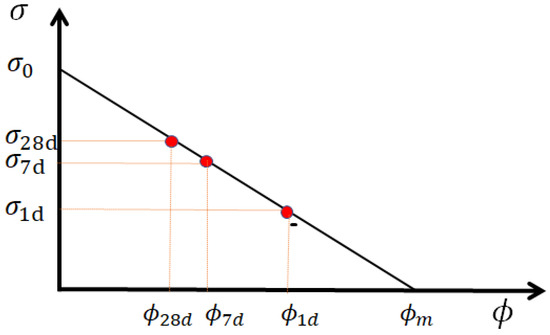 Schematic representation of compressive strength as a function of porosity. is the critical (lowest) porosity at zero strength, whereas , and are porosities at 1, 7 and 28 days, giving, respectively, the compressive strengths , , in a linear relation. The maximum compressive strength is obtained when porosity reaches zero (if possible).