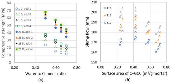 (a) Compressive strength of the different additions at days 1 and 28 as a function of the water-to-cement ratio; (b) Evolution of the slump flows measured with the shock table after 10, 13 and 16 shocks as a function of the surface area of cement and GCC (C + GCC).