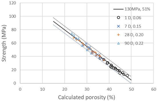 Compressive strengths of the four different additions of GCC presented in Table 6 at 1, 7, 28 and 90 days as a function of the calculated porosity. The line corresponds to the linear evolution of compressive strength with porosity, as explained in Equation (3), with . The dotted lines on the side represent a deviation of and of ±4%.