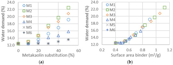 (a) Water demand as a function of metakaolin substitution and thus for the six different metakaolins. (b) Water demand as a function of surface area calculated for the two binders. The surface area of cement is taken as 0.4 m2/g, whereas those of metakaolin are obtained from the shifts to obtain the master curves. Values of the surface areas obtained from the shifts are given in Table 9.