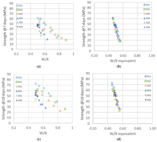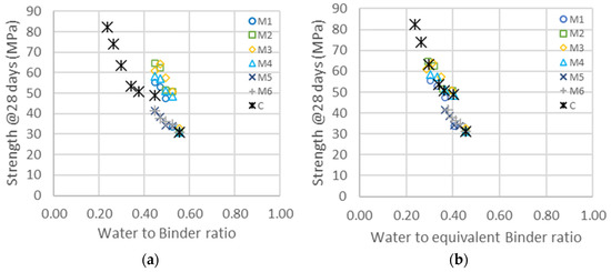 (a) Compressive strength as a function of the water-to-binder ratio for the different types of metakaolin (M1–M6) and cement addition (C). (b) Same data represented as a function of the equivalent binder-to-water ratio, following Equation (2), and considering only cement and metakaolin. The shift factors for each series are given in Table 11 ( ternary system).
