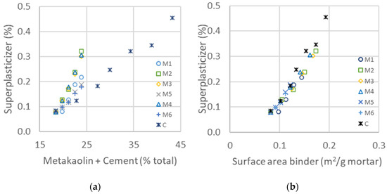 (a) Concentration of added superplasticizer needed to maintain the same flow as a function of added cement and metakaolin for different types of metakaolin. (b) Superplasticizer added to maintain a constant flow as a function of the calculated surface area of the two binders (from Table 9).
