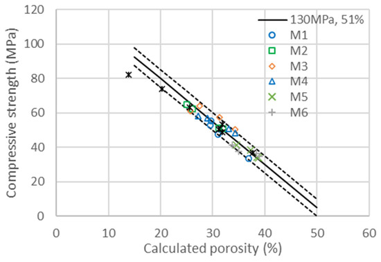 Compressive strengths as a function of the calculated porosity for the diverse substitutions of the six metakaolins (M1–M6) and cement (C) presented in Table 10 at 28 days. The continuous line corresponds to the linear evolution of compressive strength with porosity, as explained in Equation (3) with and . The dotted lines are a variation with ±4% of both and .