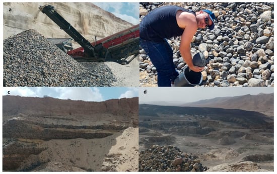 The chert rock is a typical and intrinsic by-product in the quarrying of sand in the Mishor-Rotem region (Figure 3a). This is dark, stripped, highly abrasive, and strong gravel (Figure 3b) of rock, sometimes covered with white carbonate material. The typical size of the gravel ranges from 5 cm to 20 cm (Figure 3b), but it appears in horizons to be 0.2 m to 1 m thick; sometimes, it is randomly distributed in the geological section of sand (Figure 3c). The average content of chert rock in the sand deposit, according to a visual assessment, is estimated at 30% of the volume (Figure 3c). The attempts to produce the different types of aggregate using the ordinary technologies of rock fragmentation were economically unsuccessful up to date due to its high abrasiveness and the specific flaky shape of chert fragments after comminution. This situation has led to the concentration of a significant amount of chert “waste” in the quarries (up to 19 million tons) and, as a consequence, to the non-optimal use of natural, economical materials and the area of open pits (Figure 3d). This paper deals with the wide study of mechanical, physical properties and the chemical composition of chert gravels. Its motivation is to understand which of them can assist in developing the methodology of gravel comminution to meet the aggregate requirements in the asphalt and concrete industry.