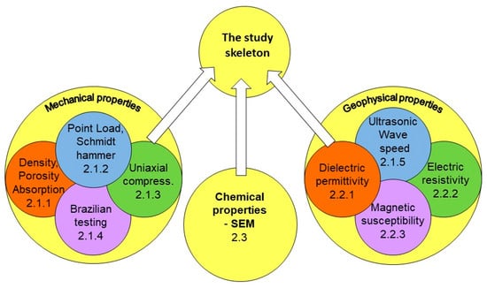 The research skeleton is shown in Figure 4. It is seen that the study was designed to consist of three main phases: a. the phase of the study of mechanical properties (Section 2.1.1, Section 2.1.2, Section 2.1.3 and Section 2.1.4); b. the phase of the study of geophysical properties (Section 2.1.5, Section 2.2.1, Section 2.2.2 and Section 2.2.3); c. the phase of the study of chemical properties (Section 2.3).