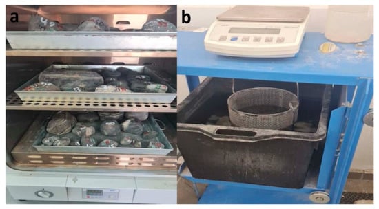 The study was carried out using a standard ASTM D2216–10 test []. All chert specimens were dried for 24 h in an oven at 110 °C to exclude free water from their pore space (Figure 5a), and the values of oven-dry weight ‘A’ for all samples were measured. The measurements were carried out using the Archimedes method [,], with the specific gravity frame instrument shown in Figure 5b (Buoyancy balance system, Matest, Treviolo (BG), Italy); all specimens were previously immersed in water for two weeks to reach their full saturation.