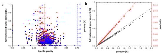 (a) The relationship between the values of specific gravity, fully saturated water content (in black), void ratio (in red), and porosity (in blue); (b) the relationship between the values of porosity, fully saturated water content (in black), and void ratio (in red).