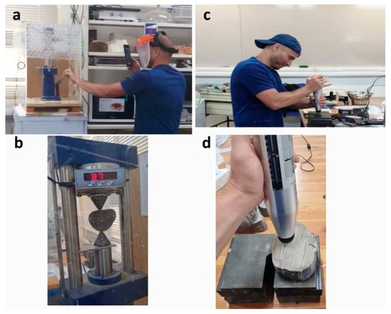 Figure 7 exhibits the instruments used for the experimentation as follows: Figure 7a,b for the Point Load (Digital Point Load tester 100 kN, Matest, Treviolo (BG), Italy) while Figure 7c,d for the Schmidt hammer (Rock classification hammer, Matest, Treviolo (BG), Italy) studies, respectively.