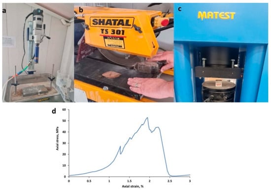 (a) The drilling machine used in attempts to prepare cylindrical samples for the strength study; (b) the Shattal Diamond Disk Saw used for the cubic samples’ preparation; (c) the typical cubic sample within the compression machine; (d) The typical strain-stress diagram.