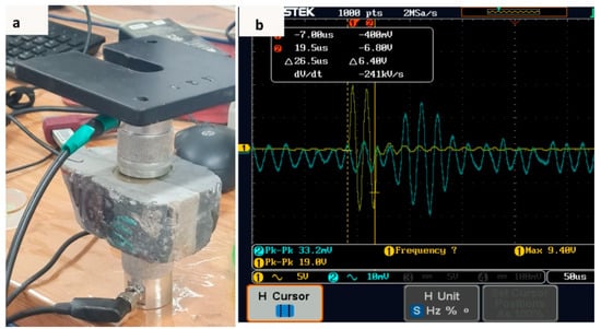 Elastic dynamic properties were studied by the first arrivals method [,] using a US pulse generator (TG5011A), a digital oscilloscope (GDS1054B), and two US sensors- (75 kHz resonance frequency). The Open Wave software will be used for data recording. Figure 10a shows the sample assemblage for the US study, while Figure 10b exhibits the typical result of measurements. For the mean value, see Table 1.