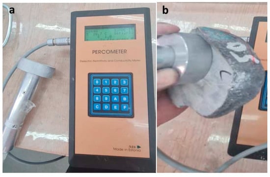 The dielectric permittivity studies were carried out using the Percometer instrument (Figure 11a), which measures the real part of the relative permittivity based on the change in capacitance caused by the material at the end of the probe in the frequency range of 40–50 MHz []. Figure 11b shows the measurement procedure.