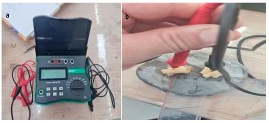The measurements were conducted using a DY4106DUOYI resistivity meter (Figure 12a) with two electrodes (Pole-Pole array []). To ensure accurate measurements, two pieces of sponge saturated with a 15% salt-water mixture were used (Figure 12b) while the distance between two pins (electrodes) was 3 cm. The electrical resistivity of the chert samples was calculated using the expression for the Pole-Pole array []: