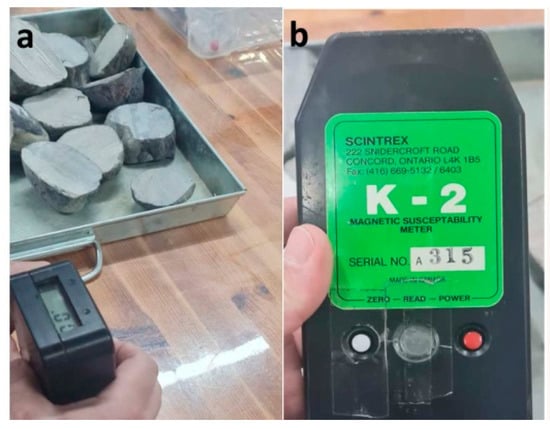 (a) The measurement of magnetic susceptibility; (b) The Scintrex instrument for magnetic susceptibility study.