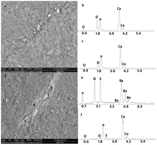 (a) The SEM picture of the inclusions in the chert rock, 1 and 2 denote the location of the measurements; (b) the results of measurements in point 1; (c) the results of measurements in point 2; (d) the second example of the SEM picture of the inclusions in the chert rock, 3 and 4 denote the location of the measurements; (e) the results of measurements in point 3; (f) the results of measurements in point 4.