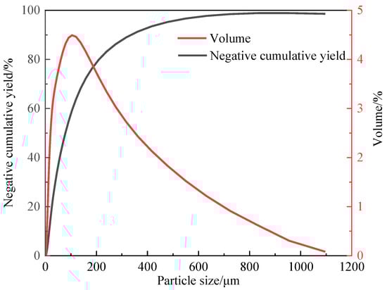 The raw muscovite used in this research was taken from Henan Province, China. Samples finer than 1.2 mm were obtained after crushing. The particle size characteristic curve of the sample is shown in Figure 1. Empyrean X-ray diffraction (XRD) instrument produced by PANalytical B.V. in the city of Almelo, The Netherlands was used to test the 2 cm × 2 cm muscovite sheet, and the test results are shown in Figure 2. The chemical composition of muscovite was studied using the Zetium X-ray fluorescence (XRF) spectrometer produced by PANalytical B.V. in Almelo, The Netherlands. For sample preparation, muscovite was ground to less than 0.074 mm, then dried for 2 h and placed at room temperature for testing. The test results are shown in Table 1. Figure 2 illustrates that muscovite has good crystallinity. It can be seen from Table 1 that the contents of SiO2, Al2O3, and K2O in the samples were 43.614%, 35.900%, and 8.360%, respectively. The muscovite content in the sample exceeds 90%, which met the experimental requirements.