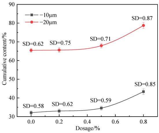 It can be seen from Figure 3 that with the increase in the SHMP dosage, the content of −10 μm and −20 μm increased, and the standard deviation (SD) of each group of data are less than 1, which is representative. Without SHMP, the contents of −10 μm and −20 μm in muscovite products are 32.10% and 65.43%, respectively. When the dosage of SHMP is 0.8%, the contents of −10 μm and −20 μm in the muscovite products are 43.35% and 78.74%, which increased by 11.25% and 13.31%, respectively, compared with the products without SHMP.