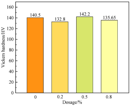 Reagent adsorption may change the hardness [30]. To determine the effect of SHMP on the muscovite hardness, the Vickers hardness test was conducted on muscovite treated with different dosages of SHMP. The test results are shown in Figure 5.