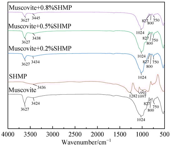 In Figure 6, the absorption peaks of muscovite at 3627 cm−1 and 3424 cm−1 are the stretching vibrations of -OH in Al-O-H and Si-O-H groups. A total of 1024 cm−1 is the stretching vibration peak of Si-O group in muscovite, 800 cm−1 is the O-Si-O symmetric stretching peak, and 750 cm−1 is the symmetric stretching vibration peak of the Si-O [31,32]. In the spectrum of SHMP, 1282 cm−1 is the stretching vibration peak of P=O, and 1097 cm−1 and 992 cm−1 are the characteristic peaks of P-O [33]. With the increase in SHMP dosage, the absorption peak at 3424 cm−1 in the muscovite product spectrum shifted to 3445 cm−1, indicating that -OH is affected by SHMP. However, there is no new absorption peak and the effective shift of other characteristic peaks in the infrared spectrum of muscovite with SHMP, indicating that SHMP may not chemically adsorbed on the muscovite surface. The reason for the shift in the absorption peak of -OH may be mechanical dehydroxylation [34].