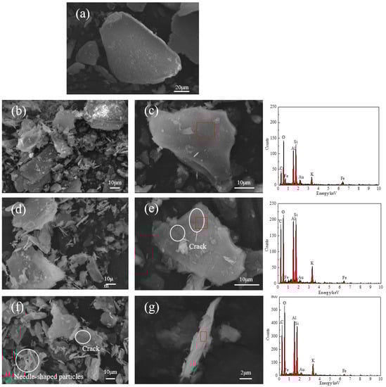 As shown in Figure 7a, the morphology of the muscovite powder without grinding showed an irregular flake shape, the surface is smooth and the boundary is clear. Figure 7b,d,f are the surface topography of muscovite products under a magnification of 1000 times. With the increase in the SHMP dosage, the needle-shaped muscovite particles decreased, the surface is roughened, the acicular muscovite fine particles increases, and the layered structure of muscovite is destroyed. There are apparent cracks perpendicular to the cleavage plane of muscovite in Figure 7f, the muscovite particles are obviously refined, and the effect of the SHMP grinding aid is significant. This conclusion is consistent with the results of XRD and grinding experiments. Figure 7c,e,g shows that the muscovite product with SHMP grinding has rough surfaces and cracks. The crack in grinding products may be due to the change in pulp environment with SHMP, which makes muscovite particles challenging to adhere to the media and increases the collision probability between particles and media. At the same grinding time, muscovite particles absorb more mechanical energy [31]. It can be seen from the regional EDS energy spectra of Figure 7c,e,g that there is no peak of the P element in the muscovite products added with SHMP as a grinding aid. Because the sample was washed muscovite powder after grinding, it means that SHMP did not form firm chemical adsorption on the muscovite surface. However, it is due to the physical adsorption generated by van der Waals force. This conclusion is consistent with the results of FT-IR analysis.