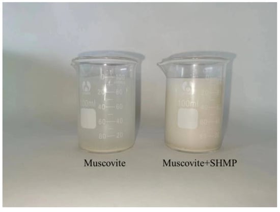 SHMP has a significant effect on the dispersibility of muscovite particles [35]. To intuitively understand the dispersion of SHMP, a settlement experiment was conducted. Two portions of 3 g muscovite powder and 100 mL deionized water were prepared to form a solution. One portion was added with 5% SHMP. Both were stirred in a magnetic agitator for 30 min and then precipitated for 2 h. The settlement results are shown in Figure 8.