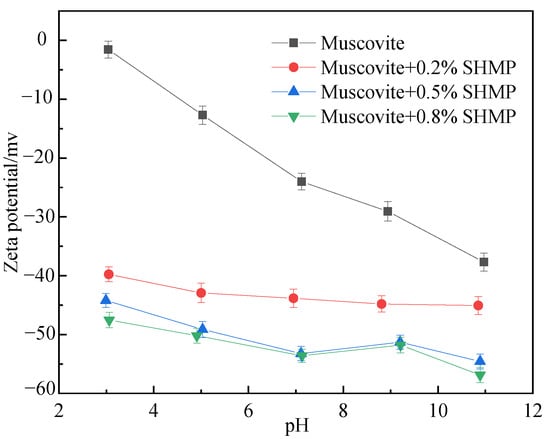 To further analyze the action mechanism of SHMP on muscovite grinding aid, the Zeta potential analyzer was used to measure the effect of different dosages of SHMP on the surface potential of muscovite. The test results of adding different dosages of SHMP to the surface potential of muscovite with the pH of the pulp are shown in Figure 9.