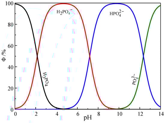 In order to further explain the cause of Zeta potential change, the relationship between SHMP hydrolyzed components and pH was analyzed, and the results are shown in Figure 10. Figure 10 shows that when the pH value is between 7.3 and 8, SHMP in the pulp exists as HPO42− and H2PO4− and attaches to the surface of the muscovite, which makes the Zeta potential of the muscovite surface increase negatively. Increasing the absolute value of Zeta potential on the surface of muscovite particles can enhance the mutual repulsion between muscovite particles and improve the dispersibility of the particles in the pulp [36,37]. The improved dispersion of muscovite particles prevents the fine particles from reuniting and adhering to the cylinder wall and increases the probability of collision between the particles and the grinding media, thus improving the grinding efficiency [38,39,40].