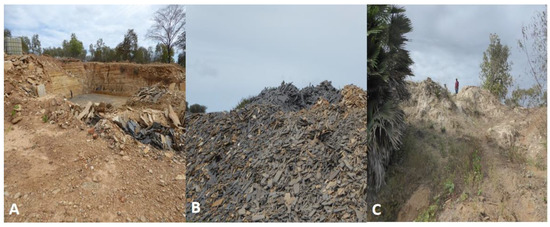 Panoramic view displaying the quarry of stratified quartzite (A), tailings (B), and tailings in powder form (≅29% quartz (Figure S1)) (C), resulting from the mining process. Altos, State of Piauí, Brazil.