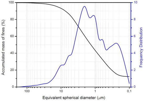 The micro granulometric characterisation of morisca is presented in Table 3 and Figure 4. We analysed the particle size distribution through the classification proposed by the International Society of Soil Science, which states that granulometric fractions smaller than 2 μm are defined as clay, granulometry between 2 and 20 μm are silt, and granulometric fractions larger than 20 μm are classified as sand [31]. Thus, the sample comprised 60% excellent quarry materials, 37.4% silt, and 2.6% sand, and an average diameter of 1.34 μm. These granulometric characteristics of morisca, mostly smaller than 2 μm, give this material the plastic characteristic of the morisca and water system, making it possible to create products similar to the clays used in the red ceramic industry [32].