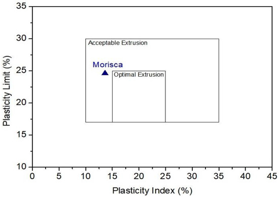 The Atterberg limits tests also facilitate an extrusion prognosis, that is, to identify whether a material is in a more favourable region for the conformation of ceramic pieces by the extrusion method. Although the specimens of this work did not use the extrusion method, which is widely used in the ceramic industry, it was still essential to show that it is possible to use morisca utilising this methodology, as at an industrial level it impacts productivity and workability with the green pieces produced [35]. In this context, Figure 5 presents the result of the morisca extrusion prognosis, which was classified as acceptable for forming parts using the extrusion method even though it was not in an optimal region.