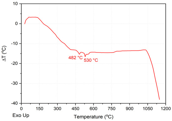 Figure 7 shows the thermodifferential analysis, where two endothermic peaks were identified. The first peak (482 °C) was associated with the dehydroxylation of clay minerals. The second peak (530 °C) was attributed to the transition from alpha quartz to beta quartz. In this case, it is crucial to maintain a low burn rate in the temperature range that composes the second endothermic peak, avoiding problems that may occur with the quartz transition.