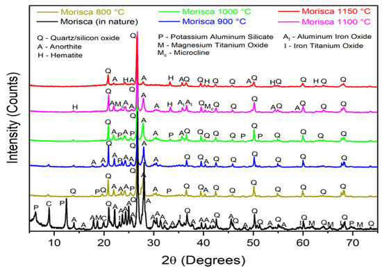 Figure 8 compares the morisca diffractograms with morisca after firing at 800 °C, 900 °C, 1000 °C, 1100 °C, and 1150 °C. The crystalline phases identified in the firing at 800 °C were quartz (PDF 01-078-1422), anorthite (PDF 00-041-1486), and potassium aluminium silicate (PDF 00-046-0741); at 900 °C they were quartz (PDF 01-00-033-1161), anorthite (PDF 01-073-00-041-1486), and potassium aluminium silicate (PDF 00-046-0741).