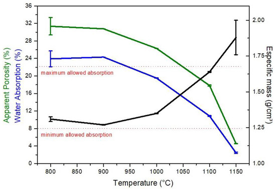 Apparent porosity is closely linked to densification and sintering resulting from the material firing process [36], making it an essential parameter for ceramic applications. In this sense, porosity was reduced from 31.37% at 800 °C, to 4.56% at 1150 °C, which affected the other mechanical properties of the parts. The behaviour of water absorption, which depends on the porosity of the specimens, maintained the same downward trend in the apparent porosity. Regarding values, the water absorption at 800 °C and 900 °C was above the values allowed in the ABNT standard, which defines that ceramic products, specifically for masonry, must have a water absorption index between 8% and 22% [37]. However, for the production of tiles, the norm only determines the maximum index allowed of 20%, emphasising that these are values for applications in temperate or tropical climates [38]. For masonry, at 1000 °C and 1100 °C, the specimens met the normative specifications, while at 1150 °C, the result was below the lower limit allowed but in regulatory compliance for the production of tiles. The amortisation in the porosity performance directly impacted the specific mass, as the reduction in void spaces in the tested bodies promoted more significant densification of the material, and consequently, an increase in the specific mass due to the decrease in porosity, starting from 1.31 g/cm³ at 800 °C, to 1.88 g/cm3 at 1150 °C [39].