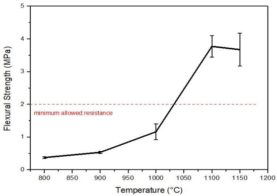 The variables AP, WA, and SM (Figure 9) directly impacted the flexural strength of the specimens shown in Figure 10. As for porosity, flexural strength is subject to the normative support of ABNT [32], which advocates a minimum strength of 2 MPa (20 kgf/cm2) for ceramic products. It can be seen in Figure 10 that the increase in temperature produced an increase in the resistance values of the specimens, but this behaviour did not meet the norm up to 1000 °C. However, at 1100 and 1150 °C, it was possible to identify compliance with the standard. The gain in strength above 1000 °C was strongly linked to the sintering of the clay minerals that emerged—calcium aluminium silicate, microcline, and potassium iron silicate—as predicted in the mineralogical analysis (Figure 8). Although calcium aluminium silicate and microcline were insufficient to place the strength at 1000 °C in the acceptable standardisation zone, their effects were added to the potassium iron silicate, raising the flexural strength for ceramic applications to a favourable condition at 1100 °C. As for the resistance at 1150 °C, where the beginning of the sintering of quartz was recorded, although it helped reduce porosity with its dense phase, in excess, it produced a slight loss in resistance, which was noticeable in our results.