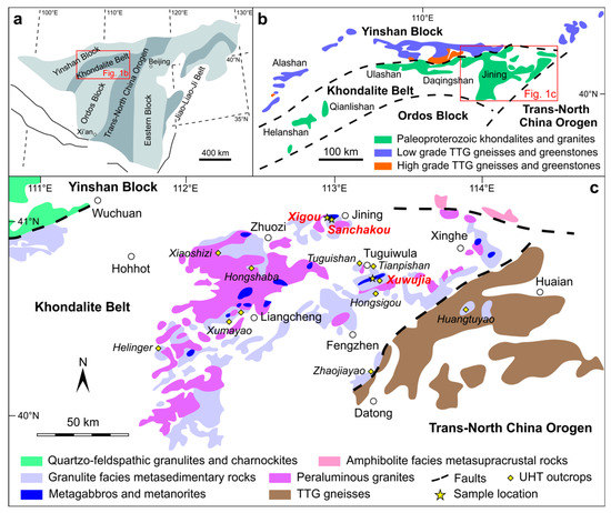 The regional geological map of the Jining terrane in the Khondalite Belt of the NCC. (a) The structural sketch of the NCC (modified from [20]); (b) The distribution map of structural units contained in the Khondalite Belt and adjacent structural units of the Khondalite Belt (modified from [20]); (c) The lithology distribution map of the Jining terrane (modified from [34]).