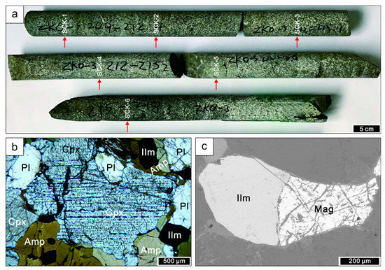 Petrological characteristics of the Sanchakou gabbros from the Jining terrane. (a) The Sanchakou gabbro drilling core (The arrows indicate the slicing and sampling positions); (b) The main rock-forming minerals, including the diopside, pargasite, and plagioclase; (c) The equilibrium assemblage of magnetite and ilmenite. Mineral abbreviations: Amp, amphibole; Cpx, clinopyroxene; Ilm, ilmenite; Mag, magnetite; Pl, plagioclase.