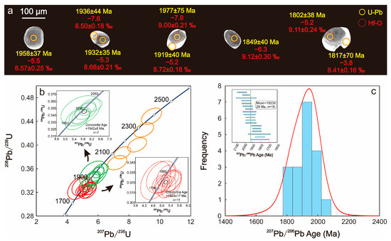 Except for the data of inheritance cores, the rest zircon grains show a “beaded” distribution along the concordia line (Figure 4b). Based on the principle of statistics, the data can be divided into two groups: the concordia age of the first group is 1942 ± 8 Ma (n = 7) and the concordia age of the second group is 1824 ± 17 Ma (n = 11). The distribution of corrected 207Pb/206Pb apparent ages ranges from 1802 ± 38 Ma to 2029 ± 39 Ma. The 207Pb/206Pb weighted average age is concentrated at 1923 ± 28 Ma (n = 18). The 207Pb/206Pb age probability density histogram shows that the data distribution is continuous (Figure 4c), and the peak value is 1941 ± 22 Ma (n = 18).