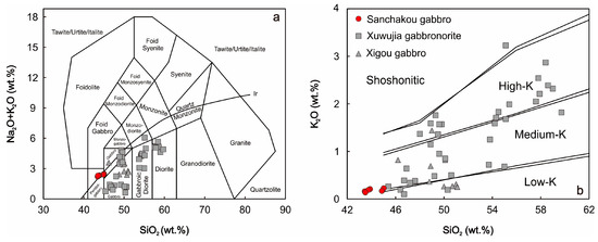 Binary classification diagrams for the Sanchakou gabbros. (a) The (Na2O + K2O) versus SiO2 diagram [77]; (b) The K2O versus SiO2 diagram [78]. The major elemental data of Xuwujia gabbronorites and Xigou gabbros are from [35].