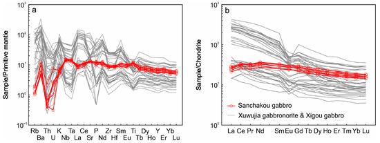 Chondrite-normalized REE (a) and primitive mantle-normalized trace element (b) patterns for the Sanchakou gabbros. The normalization values are from [79]. The trace elemental data of Xuwujia gabbronorites and Xigou gabbros are from [35].