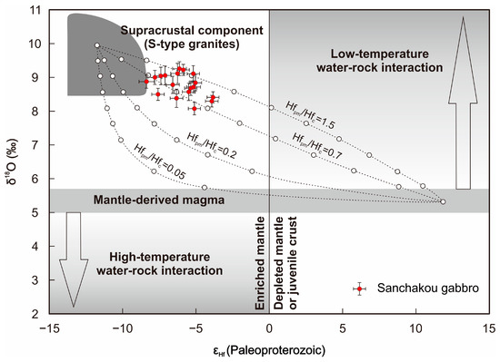 The zircon δ18O versus εHf(t) diagram of the Sanchakou gabbros. The dotted lines indicate the two-component mixing trends between the depleted mantle and the supracrust-derived magma. We assume that the supracrustal zircons have εHf(t) = −12 and δ18O = 10‰, the depleted mantle zircons have εHf(t) = 12 and δ18O = 5.3‰ [105]. Hfpm/Hfc is the Hf concentration ratio between the parental mantle-derived magma and supracrustal components indicated for each curve. The small circles on the curves indicate 10% mixing increments. The zircon Hf-O isotope compositions of the supracrustal component (S-type granites) are from [105], and those of the depleted mantle are from [75].