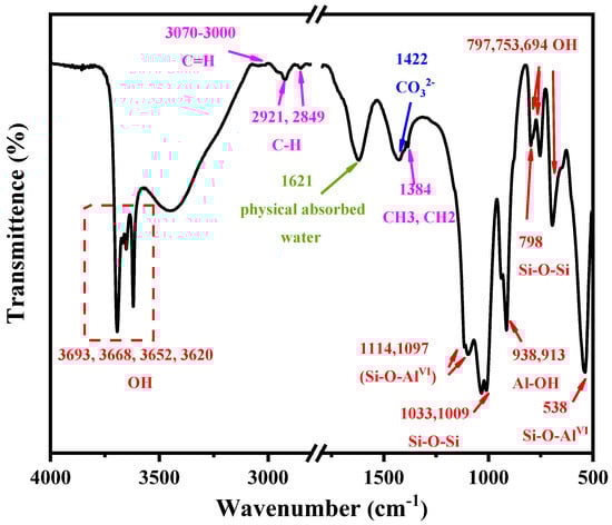 The information on the molecular structure of KAS was revealed by FTIR spectra. From Figure 2, the characteristic peaks of kaolinite, quartz, calcite, and carbonaceous material can be observed. The assignments of characteristic absorption peaks of kaolinite are presented in Table 4. It can be seen that the absorption peaks at 3693, 3668, 3652, 3620, 938, 913, 797, 753, 694, 1621, 1033, 1009, 1114, 1097, and 538 cm−1 were assigned to the OH, Si-O-Si, and Si-O-AlVI characteristic absorption vibrations of kaolinite.