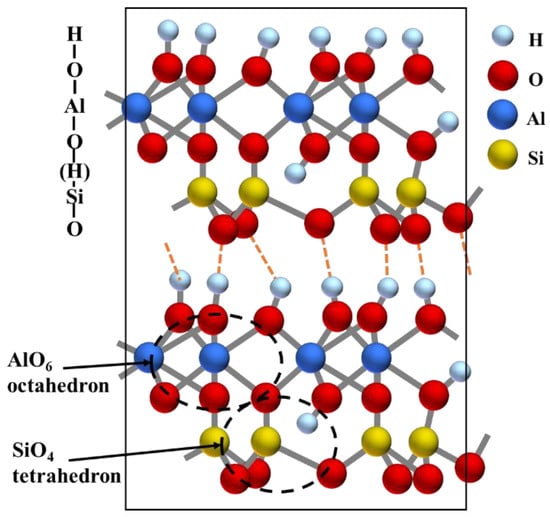 Combined with the above analysis, it can be concluded that the studied KAS collected from the north of China is categorized in kaolinite-type clay coal waste. Figure 3 shows the layer structure of kaolinite. Kaolinite (Al2O3·2SiO2·2H2O) is a 1:1 type layered aluminosilicate clay mineral. A layer of kaolinite is a structural unit consisting of a SiO4 tetrahedral sheet and an AlO2(OH)4 octahedral sheet. The two sheets are linked by Si-O-Al bonds and the inner hydroxyl groups. The inner hydroxyl groups share the plane with the apical oxygen atoms of the SiO4 tetrahedral structures. In addition, kaolinite contains another type of hydroxyl group, the outer hydroxyl group, which appeared in the outer surface of the AlO2(OH)4 octahedral sheet with the unshared plane. The unit layers are connected by outer hydroxyl groups and van der Waals forces.