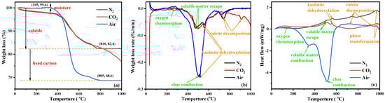 In addition to carbon, the thermal behaviors of kaolinite and calcite in the KAS were also observed from Figure 4. Under N2 and CO2 atmospheres, a certain weight loss peak and a significant endothermic peak were observed around 550 °C, which were primarily attributed to the thermal decomposition of kaolinite [26,44]. However, under air atmosphere, the slight weight loss peak of the thermal decomposition of kaolinite shifted to a low temperature (510 °C), and the endothermic peak of kaolinite decomposition was not observed. This was because the decomposition of kaolinite occurred at the same stage as the combustion of carbon, and the heat generated by the combustion of carbon accelerated the decomposition of kaolinite [25,27]. As the temperature increased, a mild exothermal peak was observed at 950 °C on the DSC curve of each atmosphere, and there was no mass loss on the TG curve under the same temperature range, which was a sign of the new aluminosilicate crystalline phase formation [25].