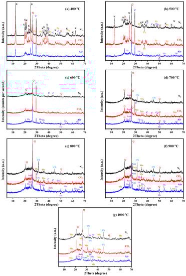 According to Figure 4a, the mass loss of the KAS was significantly different with temperatures under oxygen (air) and oxygen-free (N2 or CO2) atmospheres. Under N2 and CO2 atmospheres, the mass loss of the KAS calcined before 800 °C were about 17.4 wt.%, which was related to the moisture loss before 105 °C and the thermal decomposition of minerals and carbon. It was consistent with the content of moisture (0.67 wt.%) and volatile matter (17.36 wt.%) from a proximate analysis. Under air atmosphere, the mass loss increased by 13.8%, which was caused by the combustion of carbon, corresponding to the content of fixed carbon (14.41 wt.%) of the proximate analysis.