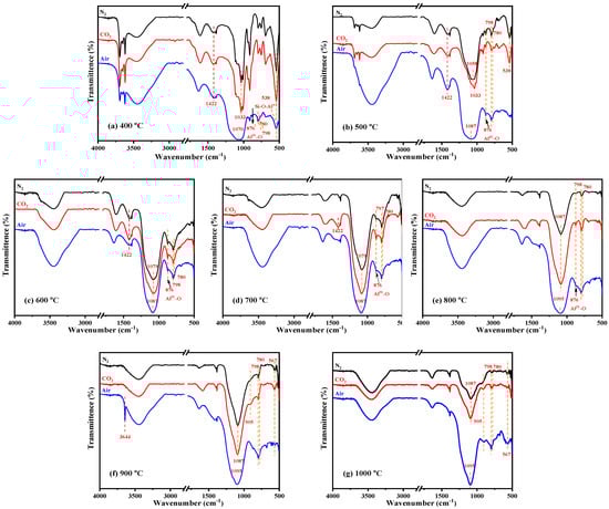 FTIR spectra of KAS calcined at 400 °C to 1000 °C under different atmospheres: (a) 400 °C, (b) 500 °C, (c) 600 °C, (d) 700 °C, (e) 800 °C, (f) 900 °C, (g) 1000 °C.