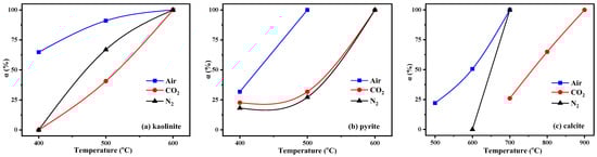 As for kaolinite, the combustion of carbon also contributed to the decomposition of pyrite and calcite, so at the same calcination temperature, the decomposition rate of pyrite and calcite under air atmosphere was highest than that under N2 and CO2 (Figure 7b,c). Moreover, the decomposition of calcite was also restrained by the CO2 atmosphere, which was because the decomposition of calcite is very sensitive to the partial pressure of CO2, and the higher partial pressure of CO2 in the system pushed the decomposition of calcite towards a higher temperature. The decomposition reactions of pyrite and calcite are show in (SI 16–17).