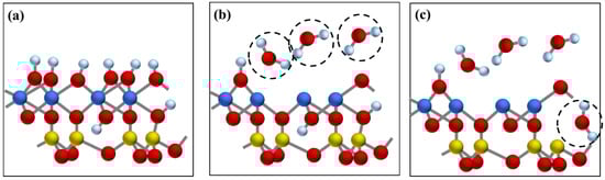 The mechanism schematic diagram of the transformation from kaolinite to metakaolinite by dehydroxylation: (a) layer structure of kaolinite, (b) escape of external hydroxyl group, (c) escape of internal hydroxyl group. Al, Si, O, and H atoms are represented by yellow, blue, red, and white spheres, respectively.