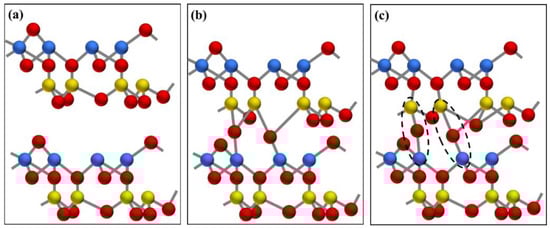 Schematic diagram of sintering between layers of metakaolinite: (a) layer structure of metakaolinite, (b) a high-energy transition state with an overcoordinated Si atom and Al−O bond dissociation, (c) a sintered structure with interlayer Al−O−Si bonds. Al, Si, and O atoms are represented by yellow, blue, and red spheres, respectively.