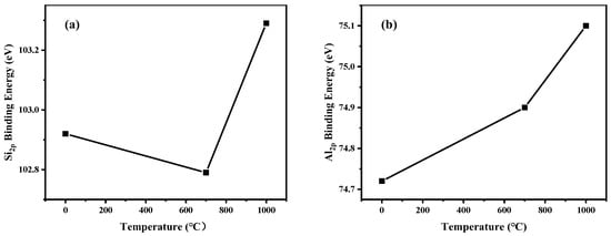 The binding energy of Si 2p and Al 2p analyzed by XPS is determined by the chemical structure of silicon and aluminum. The binding energies of Si 2p and Al 2p of raw and calcined KASs under air atmosphere were investigated and are shown in Figure 10. The Si 2p binding energy for raw KAS is 102.92 eV, and it corresponds to silicon in the Si-O bond. The Al 2p binding energy for raw KAS is 74.72 eV, which can be assigned to Al in Al-OH [49]. Compared with raw KAS, the Si 2p binding energy for calcined KAS decreased at 700 °C, and then increased at 1000 °C under air atmosphere, while the Al 2p binding energy for calcined KAS increased at 700 and 1000 °C. The lowest Si 2p binding energy was achieved at 700 °C. This may be attributed to the fact that during calcination, the hydrogen bonds between the [SiO4] tetrahedra sheet and the [AlO6] octahedra sheet in the clay minerals were broken. Meanwhile, the VI-coordinated aluminum transformed into the more tightly connected IV-coordinated aluminum, which caused the Al 2p binding energy to increase slightly at 700 °C [25].